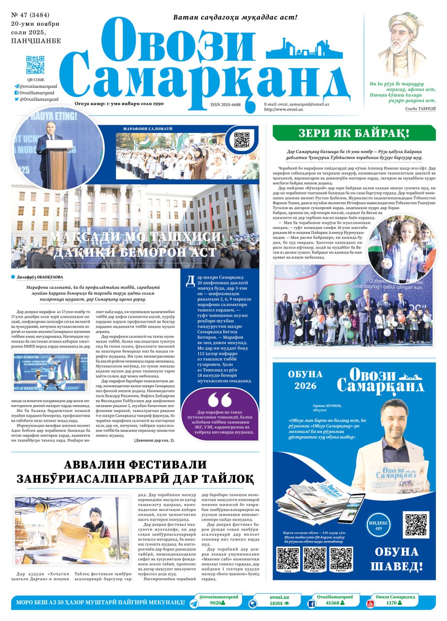 Joriy yilning 20-noyabr kuni viloyat o‘simliklar karantini va himoyasi boshqarmasi matbuot kotibi Baxtigul G‘aniуevaning "Yerlardan samarali foydalanish - hosildorlikni oshirish omili" deb nomlangan maqolasi “Ovozi tojik” gazetasida tojik tilida chop etildi.