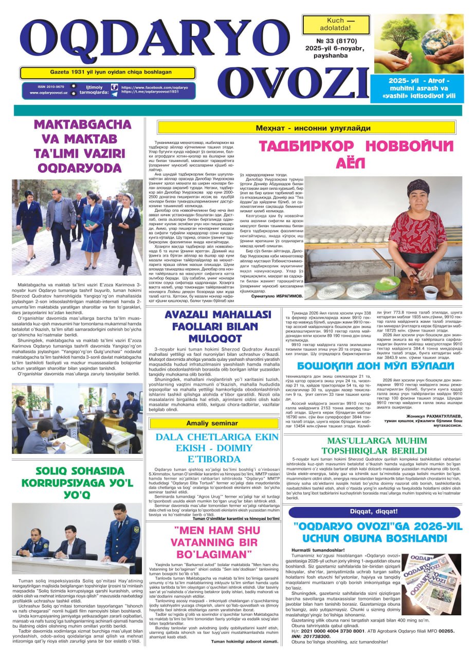 Joriy yilning 6-noyabr kuni Samarqand viloyat O‘simliklar karantini va himoyasi boshqarmasi Oqdaryo tuman bo‘limining "Dala chetlariga ekin ekish-doimiy e'tiborda" deb nomlangan maqolasi "Oqdaryo ovozi" gazetasida chop etildi.