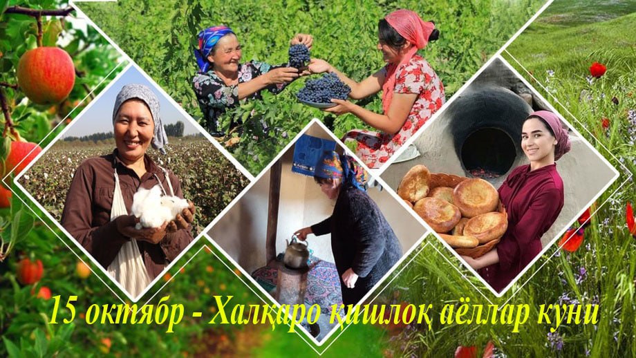 #15 октябрь_Халқаро қишлоқ аёллари куни Улар - ҳунарманд, тадбиркор, лидер 2007 йил БМТ бош ассамблеяси 15 октябрни “Халқаро қишлоқ аёллари” куни деб эълон қилди. Бу сана қишлоқ аёлларининг оила ва жамият тараққиётида тутган ўрнини эътироф этиб, уларнинг меҳнати ва жасоратини қадрлаш рамзидир.