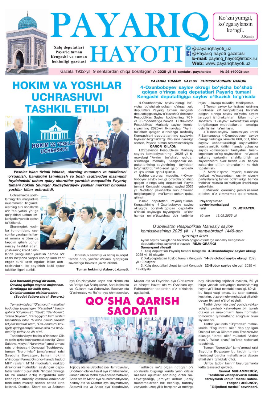 🗞"Payariq hayoti" gazetasining 2025-yil 18-sentyabr 26-sonida Payariq tuman bo‘limi inspektorlari A.Ubaydullayev, M.Hosilov, A.Tursunqulov va Sh.Olimjonovlarning "Pomidor bujmayish kasalligi" deb nomlangan maqolasi chop etildi.