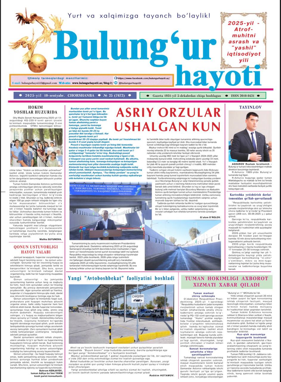 🗞"Qo‘shchinor" gazetasining 2025-yil 10-sentyabr 25-sonida Toyloq tuman bo‘limining zararli organizmalarni tarqalishini prognozlashtirish va monitoring qilish bo‘yicha yetakchi mutaxassisi G‘.Sharofovning "Sharq mevaxo‘ri - zararli hasharot" deb nomlangan maqolasi chop etildi.