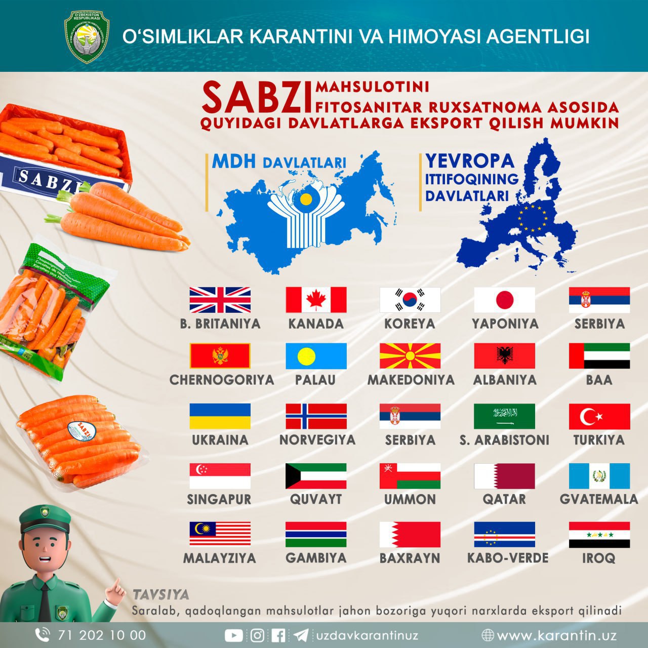 Fitosanitariya talablariga rioya qilgan holda sabzi mahsulotini yuqoridagi davlatlarga eksport qilishingiz mumkin ! 👆