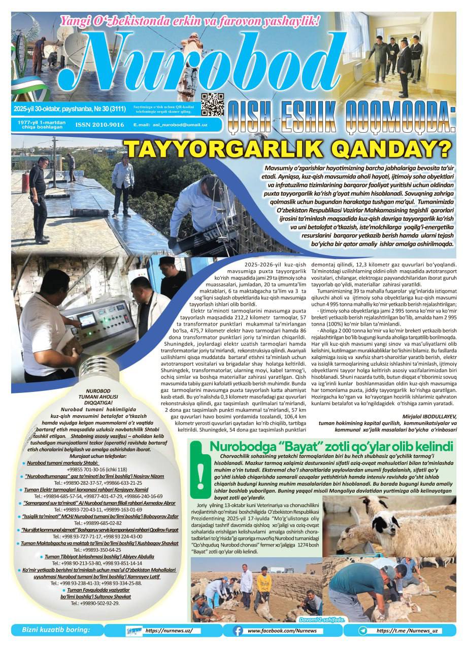 "Nurobod” gazetasining 2025-yil 30-oktabr 30-sonida tuman bo‘limi inspektori Nurbek Xushmatovning "Karantin xizmati - dehqonga ko‘makchi" mavzusidagi maqolasi chop etildi. Samarqand viloyat Oʻsimliklar karantini va himoyasi boshqarmasi axborot xizmati