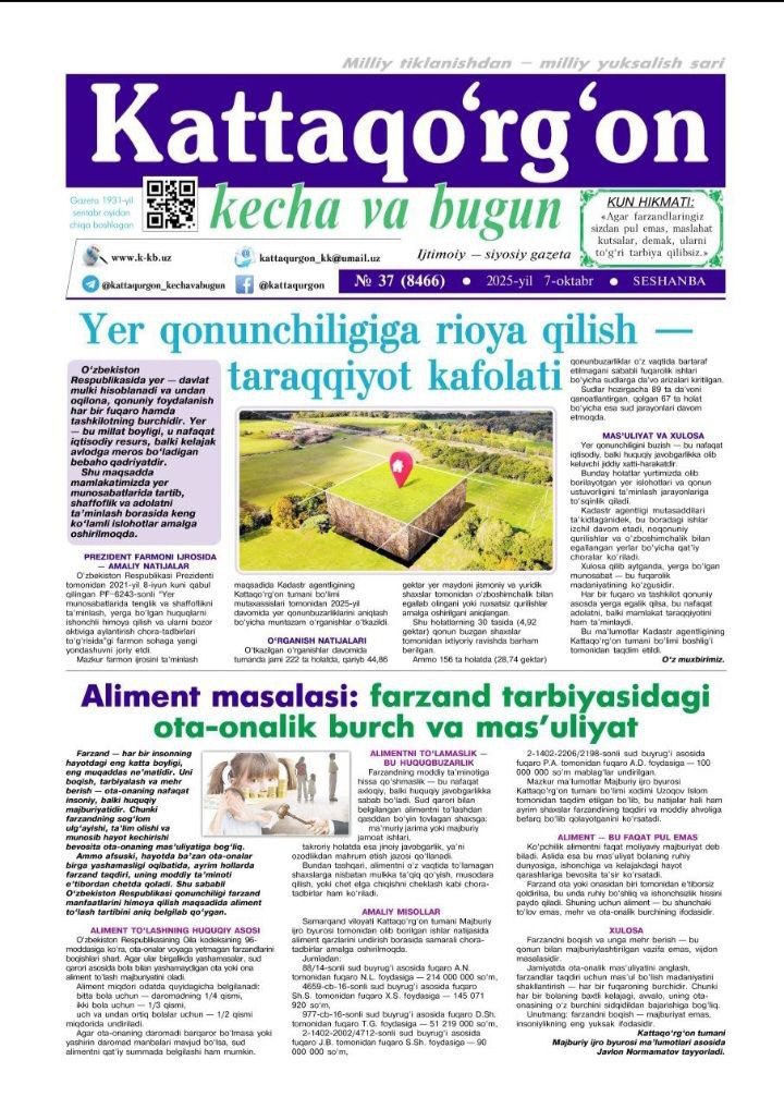 Joriy yilning 7-oktabr kuni Kattaqo‘rg‘on tuman bo‘limi inspektori J.Otaqulov va prognoz bo‘yicha mutaxassis N.Tursunovlarning "Kuzgi bug‘doy ekish" nomli maqolasi chop etildi.
